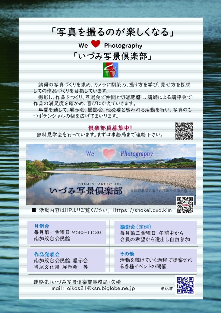 「いづみ写景倶楽部」は、「写真を撮るのが楽しくなる」をテーマにより良い写真を求め、写真の撮り方、見せ方を探求し作品づくりを行っています。 作品の作成、互選会、講師による講評会を中心に、展示会、撮影会、勉強会など行ってまいります。まずは 無料見学会におこし下さい。