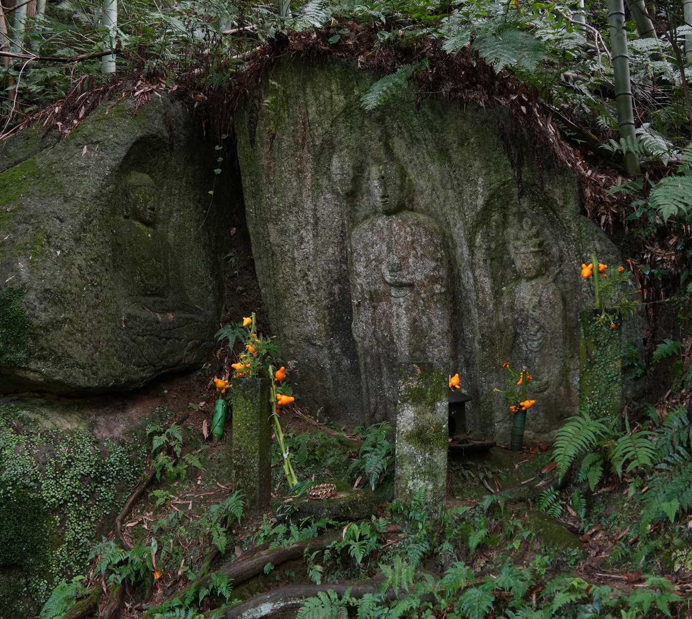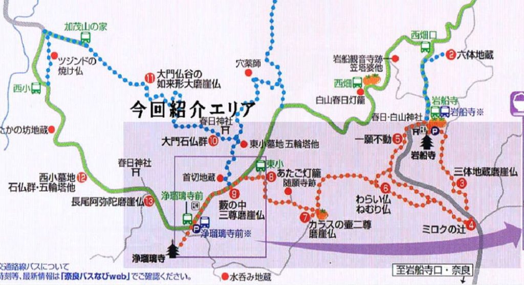 | 市内東南部の当尾地区には、多くの石仏や石塔があることで知られています。特に平安時代から修行僧の庵室や行場が設けられていた小田原には、浄瑠璃寺・岩船寺の界隈に、鎌倉時代後期から室町時代にかけて、行き交う人々のために多くの磨崖仏が造立されました。これらは、道を行き交う人々を優しく見つめてくれる道しるべとしての石仏達です。南都の近郊という立地からでしょうか、繊細で芸術性の高い石仏が多く点在し、石仏の里として訪れる人がたえません。(市HP) |