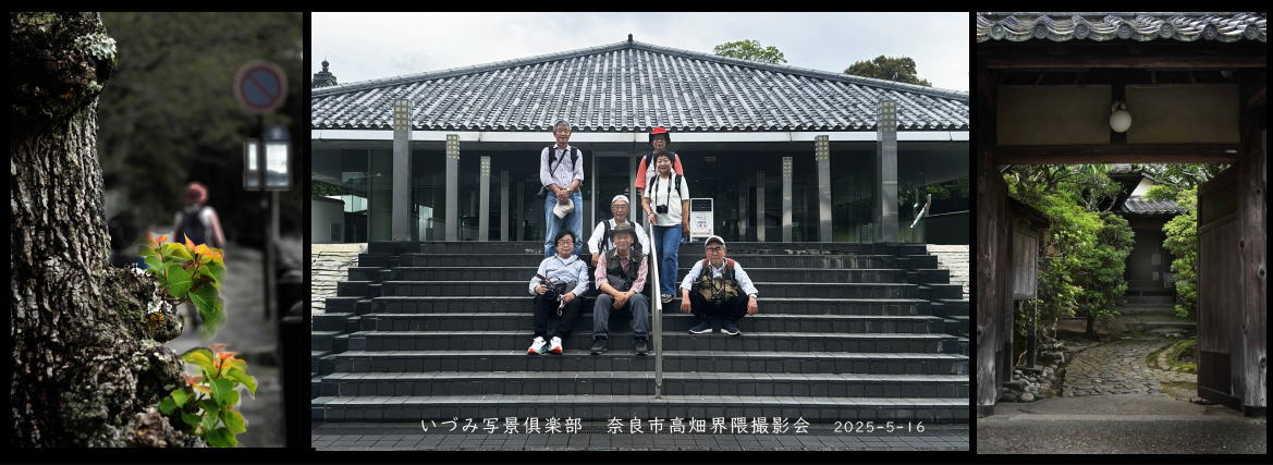 ■撮影会 奈良市高畑界隈 2025-5 2025-05-12 撮影会報告 午後には雨との予報の下での撮影会であったが、幸い雨もなく快適な撮影会となった。参加者7名が2台の車で国指定登録有形文化財「志賀直哉旧邸」に集合し、その後ゆっくりと想定したコースをたどった。撮影とは直接関係ないエコロジカルな住宅訪問(話を聞)などもあり、穏やか、和やかなゆったり時間の「大人の撮影会」?とも言うべき撮影会だった。高畑界隈は奈良公園、春日大社にみる喧噪感がなく、豊かな自然、日常生活の地で、歴史を感じさせる要素も点在落ち着きを感じさせる界隈である。そんな雰囲気をどう撮影できたか、今後出てくるあろう作品がたのしみである。帰りに反省会と称しながらランチ(オランダ屋)を皆で楽しみ、今後の会の話し合なども加えた雑談を楽しみ解散とした。 概要 開催地 奈良市高畑界隈 開催日時 2025年5月16日(金) 集 合 志賀直哉旧居前 9:30 交通手段 自家用車乗り合い A号車 3人 B号車 4人 C号車 人 費 用 280円(移動代) 必要経費 参加者分担 駐車場代 500円/台 入館料 500円/人 参 加 自由参加 出席者 7名 連絡先 森本 参 考 志賀直哉旧居(国登録有形文化財) 紹介HP コース案: 集合場所から東進、上の禰宜道入口あたりで南へ、新薬師寺を回って戻ってくる。 約1時間弱(寺の拝観等は含みません) 後は、下禰宜道の散策又は荒池の方に足を延ばす等々で1時間。 最終11:30 志賀直哉旧居前に集合