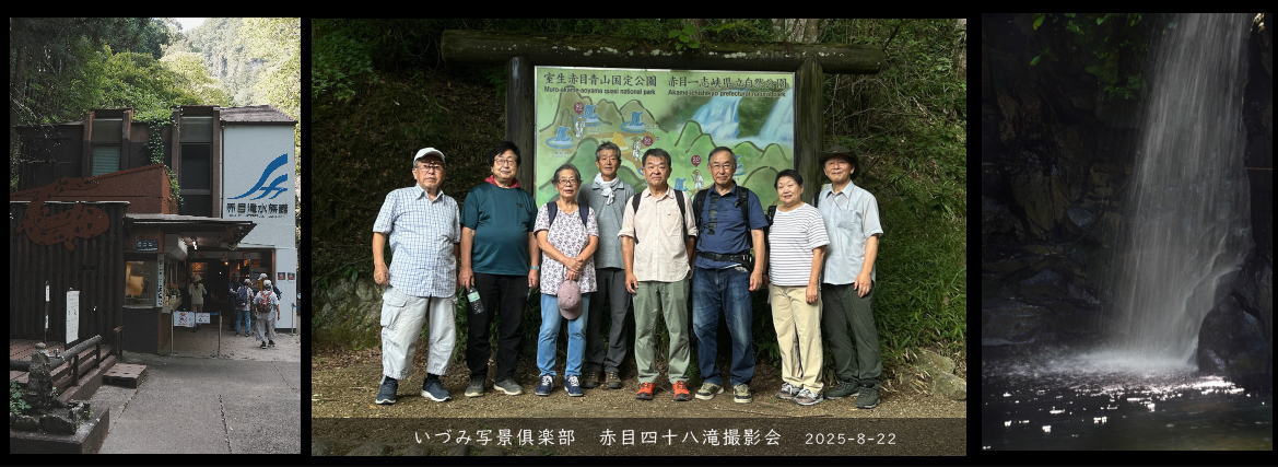 | 概要 開催地 赤目四十八滝 三重県名張市赤目町長坂671−1 開催日時 2025年8月22日(金) 集 合 現地 交通手段 自家用車乗り合い A号車 4人 B号車 4人 C号車 人 費 用 560円(移動代) 必要経費 参加者分担 駐車場代 0 円/台 入山料 高齢者500円、一般1000円/人 参 加 自由参加 出席者 写真参照 連絡先 森本 参 考 紹介HP https://www.akame48taki.com/ |