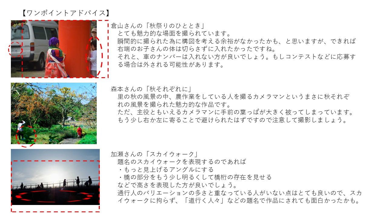 提出作品に対して、中山講師が気になる事柄をまとめて頂きました。各自の作品を見直し今後の作品づくりの参考としましょう。
