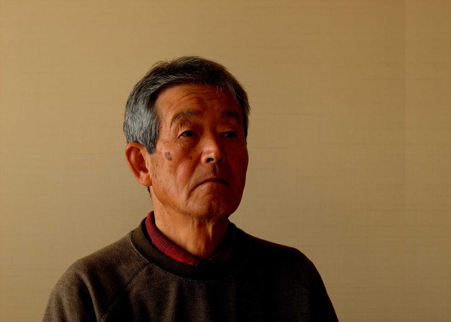 ・顔を向けた右側を開けた構図と上着と同系色のシンプルな背景がとてもよい効果を出しています。